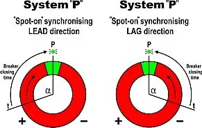 The dynamically controlled system "P" provides the fastest "spot-on" synchronisation. Dynamic breaker closing time compensation assures precision 12 o’clock synchronisation, when frequency of incoming generator is slightly higher than busbar frequency.